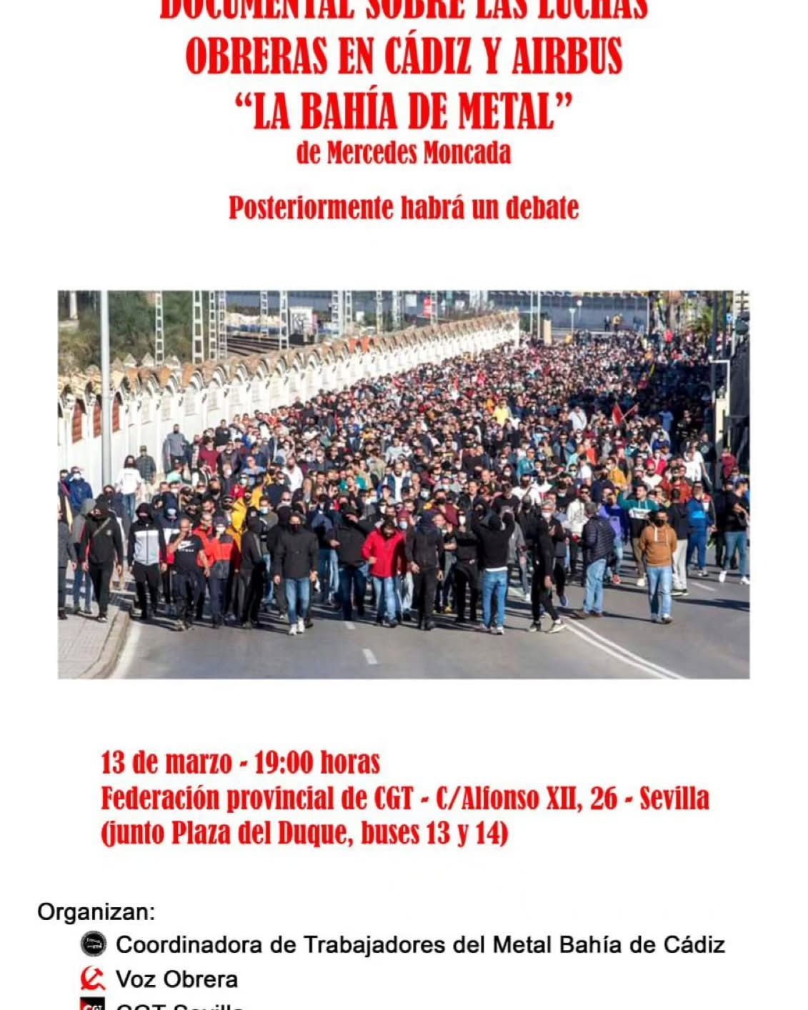 Desde Voz Obrera os invitamos a asistir al documental “La bahía de metal» que muestra las luchas obreras en Cádiz y en Airbus. De las subcontratas que juegan un papel en la precarización del mundo del trabajo y la respuesta por parte de los trabajadores.